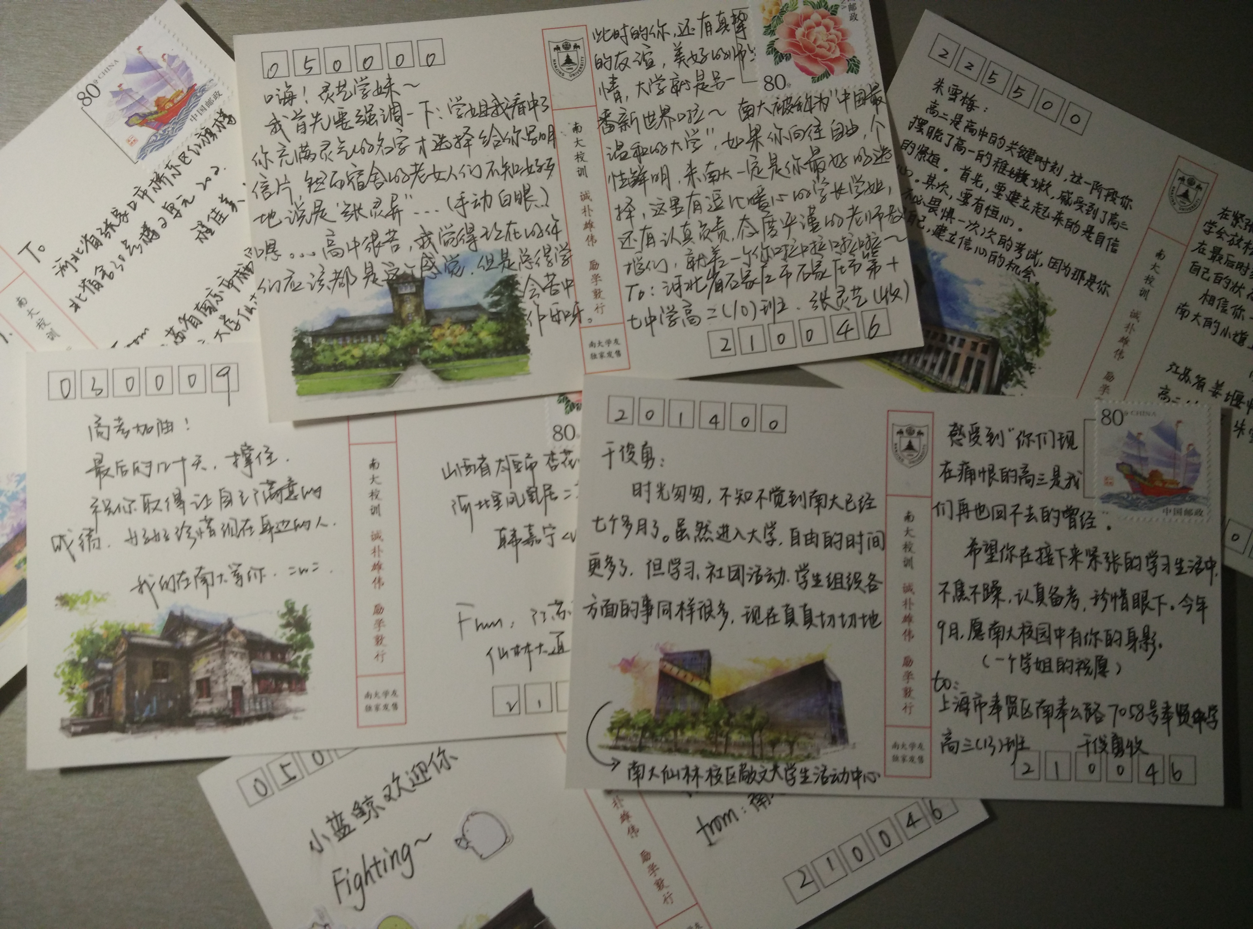 在2016年高考来临之际,无码a片 本科一年级同学心系母校高三同学,也怀着对全国各地向往南大的莘莘学子的浓浓深情,在年级干部们的组织策划下,发起了“春风化语,助力高考”系列明信片送祝福活动。