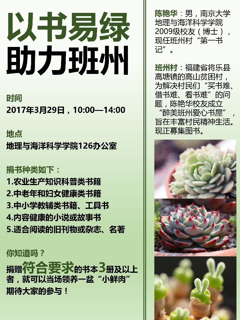 329日,地理学院举行了“以书易‘绿’ 助力班州”捐书活动。本次活动由毕业班同学发起,号召全院师生为福建省班州村(贫困村)村民捐赠书籍,以解决农村村民买书难、借书难、看书难问题。活动从着手准备之时就获得全院师生的热切关注和积极响应。