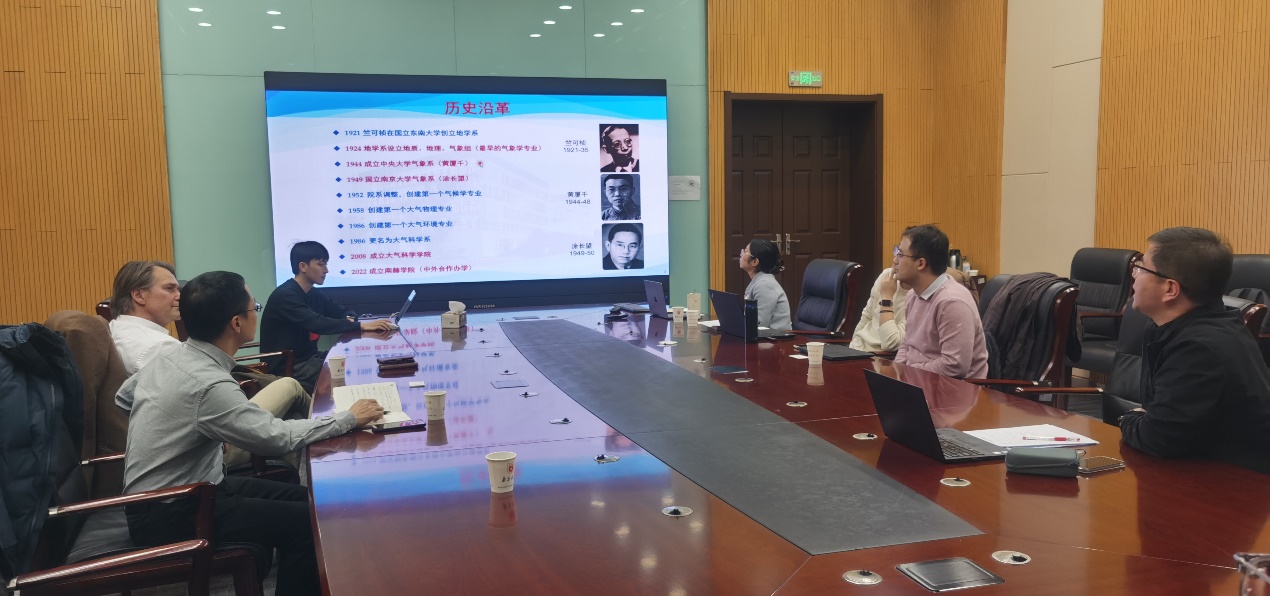 1月21日,Petri Pellikka教授前往南京赫尔辛基大气与地球系统科学学院(南赫学院),会见了芬兰科学与文学院院士Markku Kulmala教授、南赫学院副院长王海琨教授、大气科学学院副院长郭维栋教授等,并与郭维栋教授研究团队开展了学术研讨,听取了4名优秀青年科学家的研究进展汇报,针对积雪模型、积雪气候响应、极端天气气候事件等热点问题进行了深入的交流。