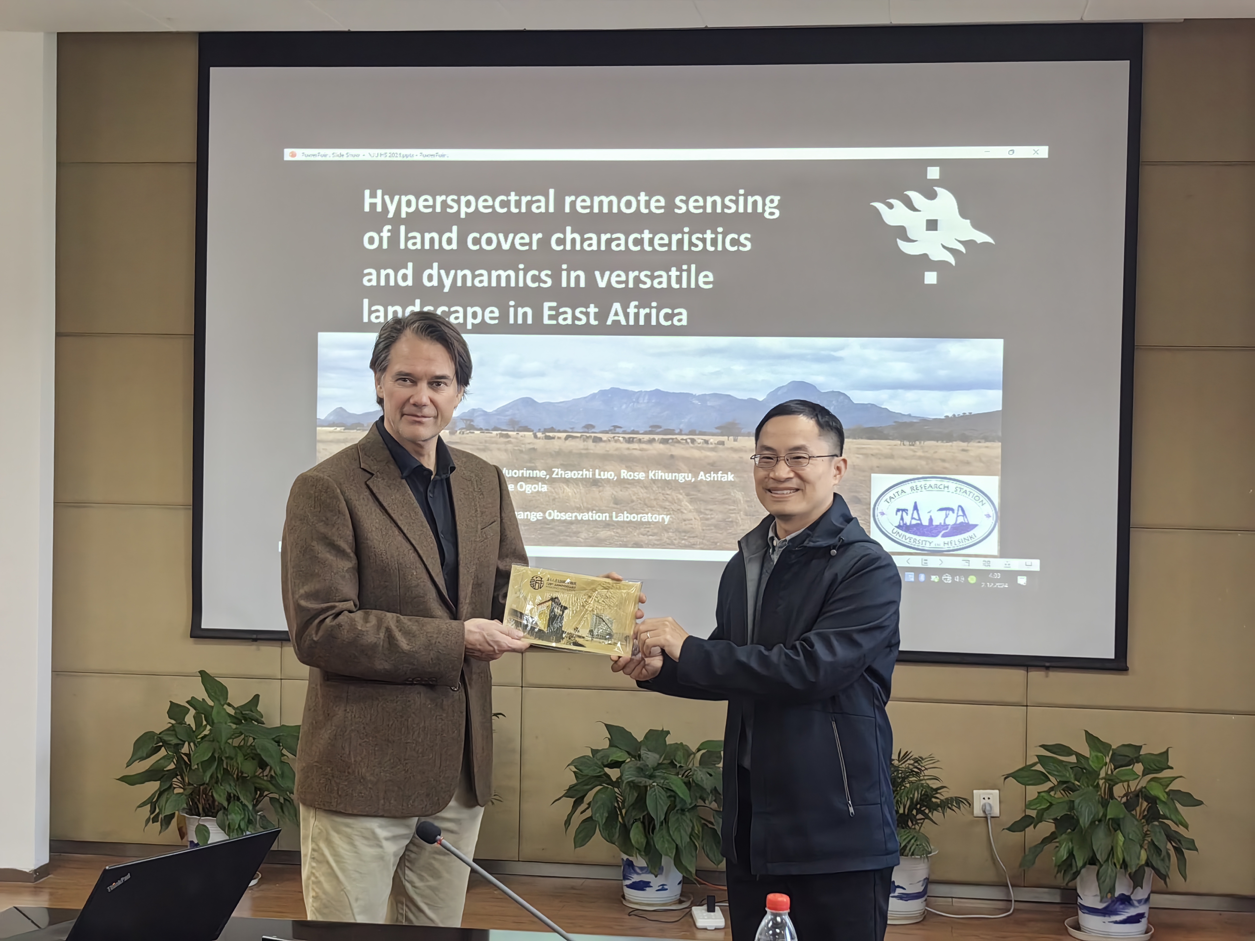 1月13日,无码a片 院长鹿化煜教授向Petri Pellikka教授颁发无码a片 IFI杰出学者聘书,Petri Pellikka教授作了题为Remote sensing of the impact of land use change for ecosystem services in Africa的第一场学术报告。12月2日,Petri Pellikka教授作了题为Hyperspectral remote sensing of land cover characteristics and dynamics in versatile landscape in East Africa的第二场学术报告。系列学术报告围绕东非土地利用变化对生态系统服务和气候影响,介绍如何利用高分辨率卫星、航空飞机、无人机、地面站点等多尺度观测数据,通过遥感科学、人工智能、地理科学、生态学等学科深度交叉融合,监测土地利用与覆盖变化,揭示生态系统的响应。报告不但有无码a片 相关学科的师生积极参与交流,还吸引了南京信息工程大学、江苏第二师范学院等在宁高校以及兰州大学、海南大学等外地高校的师生参与,产生了广泛的影响。