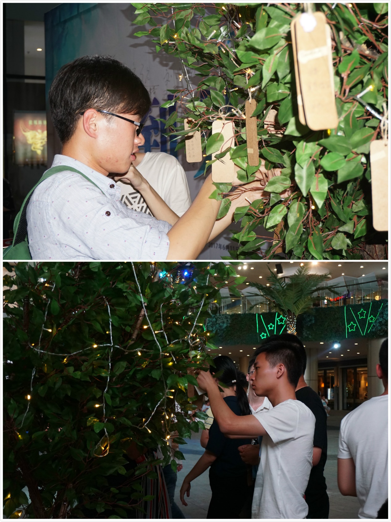 晚会的最后,同学们纷纷在心愿卡片上写上了自己对于未来,对于地理学院,对于同学老师的美好祝愿,一一挂在了集愿树上,表达自己的美好祝福。晚会结束后,地理学院2013级全体学生和老师在舞台合影,同学们也纷纷合影留念,珍惜大学里最后的时光。欢笑、拥抱、祝福……南大地理人即将面临分别,但这一次我们不说再见,因为我们会一直带着南大的记忆,相约在未来的美好相遇。