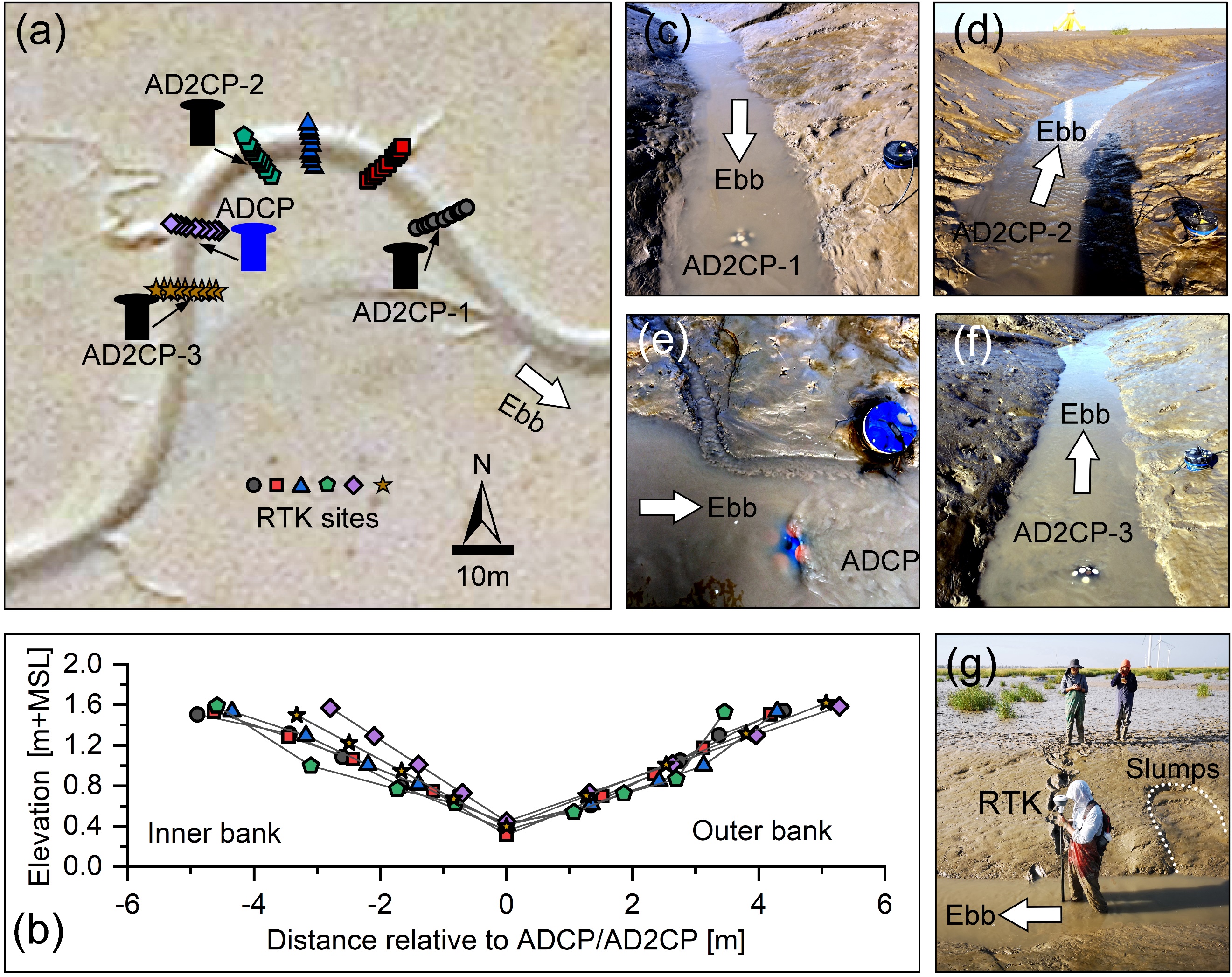 研究团队利用声学多普勒流速剖面仪(ADCP/AD2CP)对发育在江苏洋口潮滩上的潮沟河曲典型弯道的不同位置进行了覆盖大小潮周期的现场同步流速观测(图2)。研究发现,光滩潮沟的涨落潮流速峰值均出现在水位低于沟岸以下阶段。这与盐沼潮沟的观测结果不同,后者因其更高的沟岸位置和更茂密的植被覆盖度一般具有更强的水流限制效应(flow confinement),使得涨落潮流速峰值常出现在水位刚好达到或高于沟岸阶段。