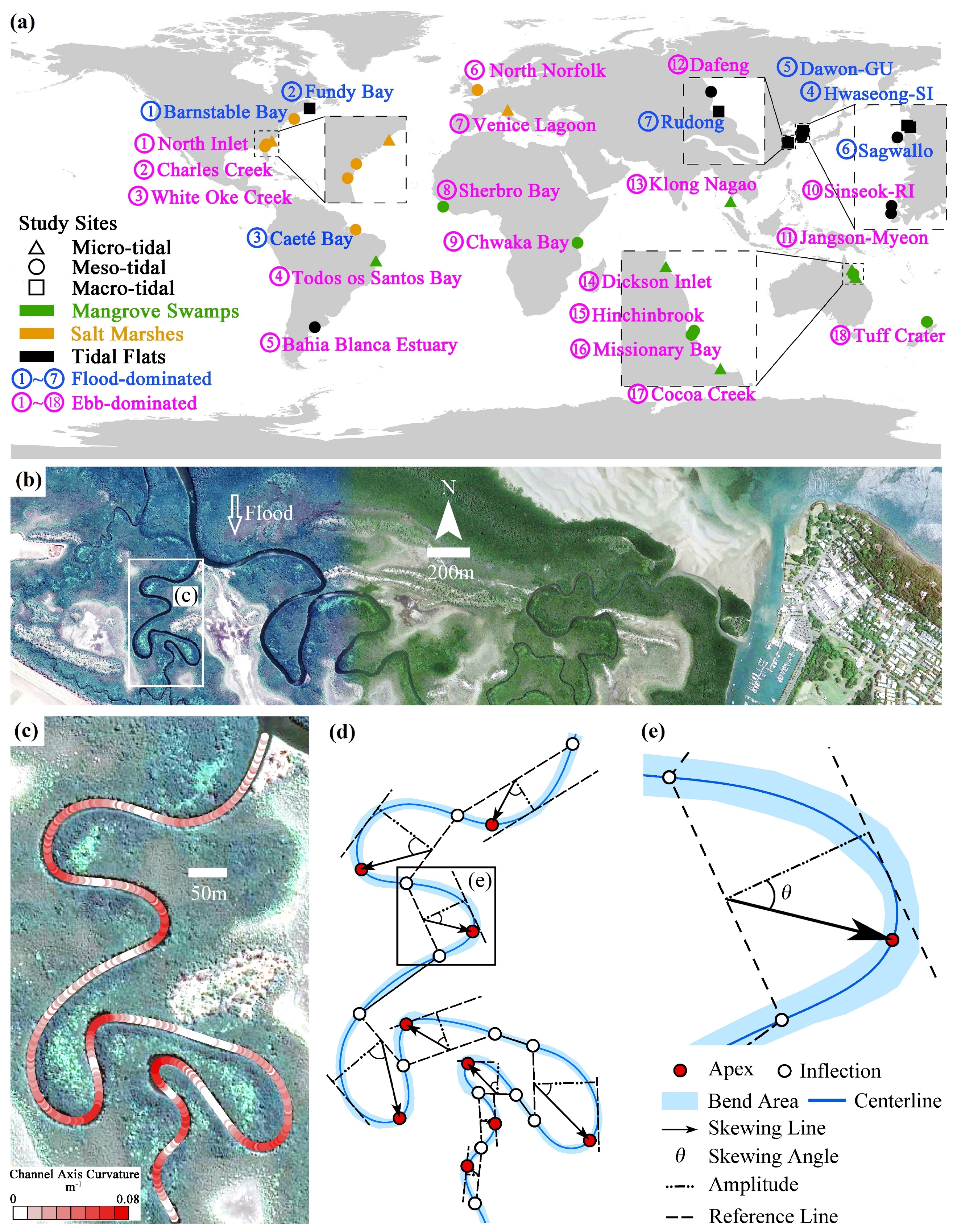 此外,团队跟根据潮差、植被覆盖度和潮汐不对称状况对全球25个研究区的232条潮沟河曲进行了分类,后通过计算曲率识别拐点将潮沟河曲分成连续的弯道并进行地貌特征的分析(图4)。研究发现,潮沟河曲具有偏陆向扭曲的总体特征,且陆向扭曲的程度随弯曲系数(sinuosity)和振幅(amplitude)的增加而增加。控制潮沟扭曲的机制目前还不清楚,推测可能是由于落潮流在大多数潮汐环境中局地占优势(local ebb-dominance)所致。