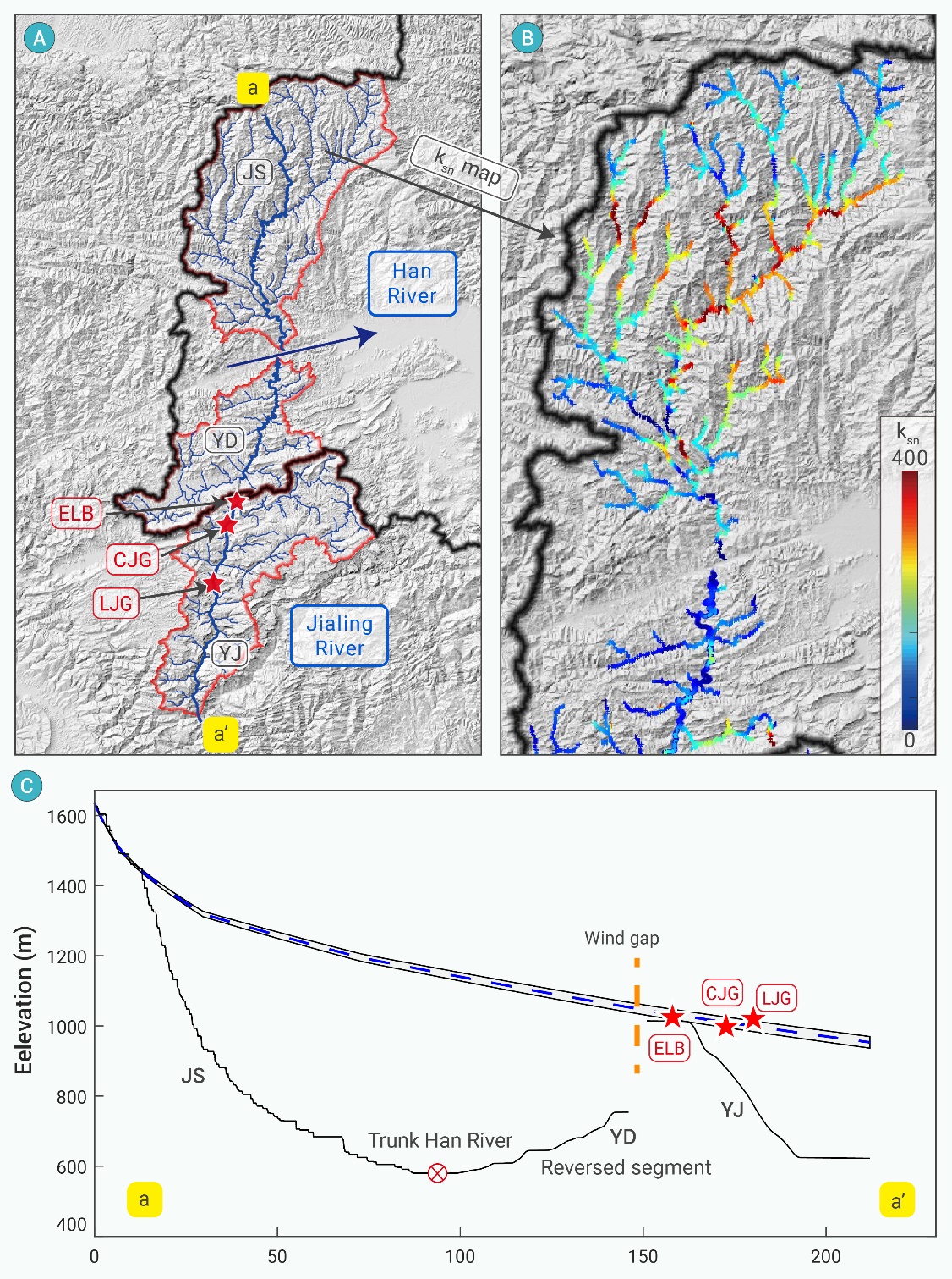 为了探索这一问题,无码a片 王先彦教授团队采用了一系列科学方法进行深入研究。首先,通过分析河流纵剖面数据,在汉江北侧支流中发现多个河流裂点(图3),且裂点的形成年代显示出由东向西逐渐变年轻的趋势,暗示了一个自东向西逐步推进的袭夺过程(图3)。进一步,基于基岩河道侵蚀模型重建了沮水河(JS)裂点下游方向的古河道剖面,这条古河道剖面与嘉陵江流域内发现的风口(WG-1)及河流阶地(CJG、LJG)相吻合,表明曾发育有南流河流的存在,后来被袭夺、转向南流(图4&5)。根据基岩河道侵蚀模型计算出的河流裂点的形成时间,推断水系间的袭夺开始于晚中新世至上新世期间。