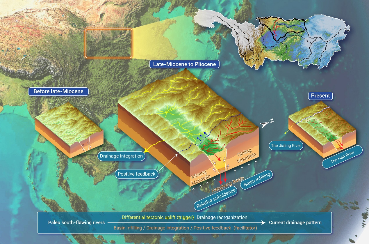 本研究阐明了长江两大支流水系重组过程,即汉江于晚中新世至上新世逐步袭夺古嘉陵江水系。这一发现为理解长江巨水系从可能流入印度洋转变为东流入东海的发育过程提供了宝贵的视角;也为造山带水系重构的识别及重建方法提供了参考。所提出的差异性构造抬升驱动的水系重组,结合盆地充填与河流袭夺过程中形成的正反馈效应,不仅对于揭示秦岭独特的水系格局演化有重要意义,也有助于深化河流系统动态变化以及地表环境形成机制的认识。