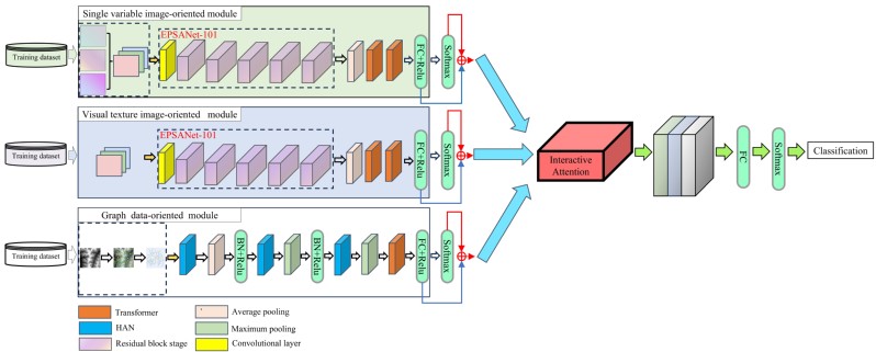 (3)知识引导的混合融合决策模块:提出一种融合特征级与决策级策略的混合融合机制。该模块通过引入交互注意力机制,将“地貌形态是成因过程外在表现”这一领域先验知识显式地嵌入模型的多模态信息整合过程,引导模型在不同数据模态间进行有重点的信息交互与协同推理,最终实现从原始多源数据到地貌类型与成因类别的端到端智能判识。