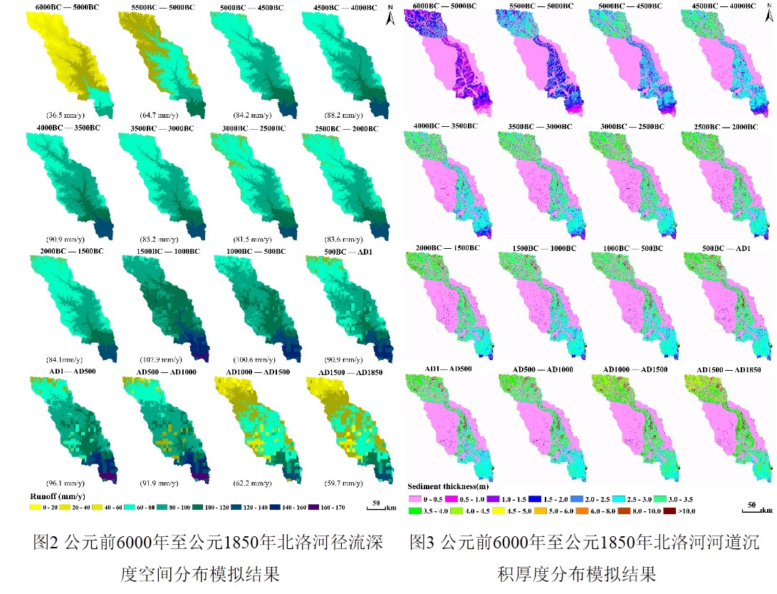 最近,无码a片 教授王先彦、博士生陈浩等,在黄土高原北洛河流域开展了全新世以来河流地貌过程的数值模拟,取得了重要进展,相关研究成果发表于国际学术期刊《Geomorphology》上。该课题组通过耦合植被蒸散发模型、古人类土地利用数据(KK10模型)以及地貌演化模型(Landlab模型),模拟了北洛河流域全新世中期(6000 BCE)至工业革命前期(1850 CE)河流径流量与泥沙量对气候变化以及人类活动的响应过程。该研究发现,早期人类农业活动导致流域内径流量的显著增加(图2),同时农业用地扩张带来的土壤可侵蚀度的改变进一步造成流域内沉积物输送量的增加,从而引起河道沉积物的堆积(图3)以及河道形态的变化(图4)。