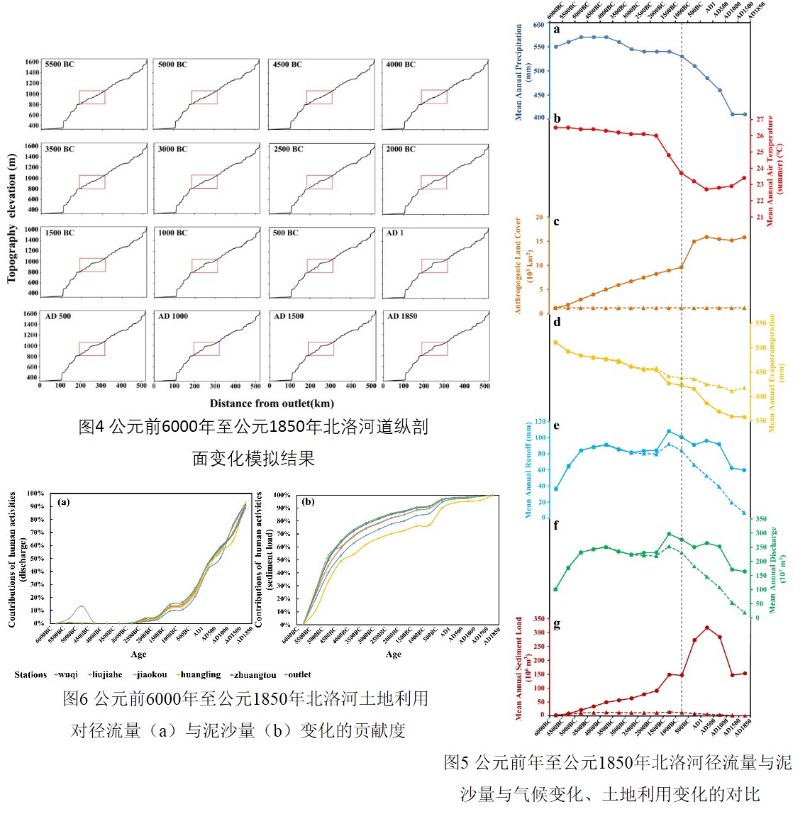 通过进一步模拟北洛河流域在有无人类活动影响(Scenario KK10A, Scenario KK10B)下的河流径流量与沉积物输送量的时序变化规律(图5),揭示流域径流量的变化主要受到气候变化的影响,而人类活动是泥沙量变化的主导因素。同时,对比两种情景下的模拟结果,计算了自全新世中期以来人为土地利用变化对于径流量以及泥沙量变化的贡献度(图6)。结果表明,早期人类农业活动导致的土地利用的变化对于早期北洛河径流量的影响较小,但对于泥沙量的贡献度早在公元前5000年便超过了50%。说明在中国黄河中游地区,早在7000年前人类活动对于河流侵蚀以及河流演化过程就存在着显著的影响。