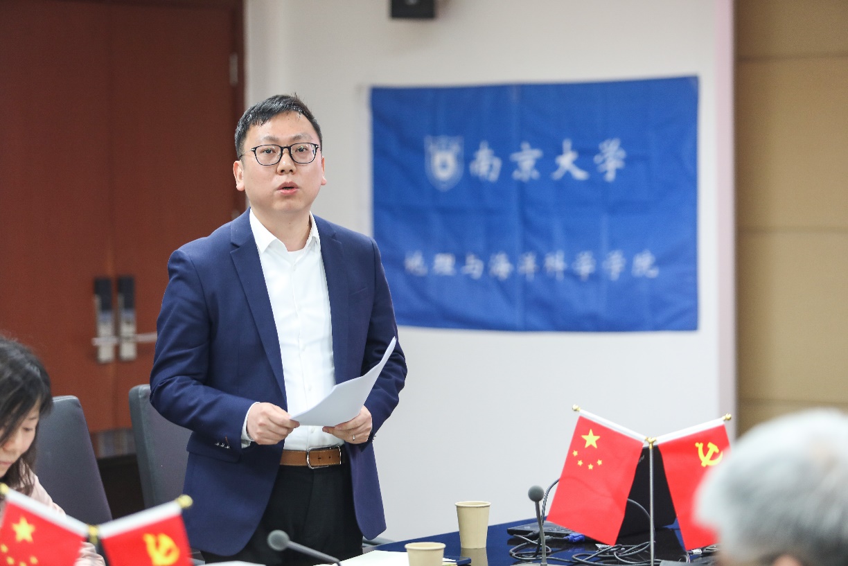 李满春书记与章锦河教授作为入党介绍人分别介绍了考察培养情况,一致认为张宏磊同志政治立场坚定,工作认真负责,热心集体事务,具备了成为中国共产党党员的条件。随后,支部书记汪侠代表支委会报告了对张宏磊的考察审查情况,支部党员们踊跃发言,充分肯定了张宏磊的思想品质与政治修养,回顾了他在日常工作中无私奉献、热爱集体的感人事迹,在科研工作中积极进取、锐意创新的意志品质,期待他再攀高峰,再创辉煌,为人文地理学科发展贡献力量。