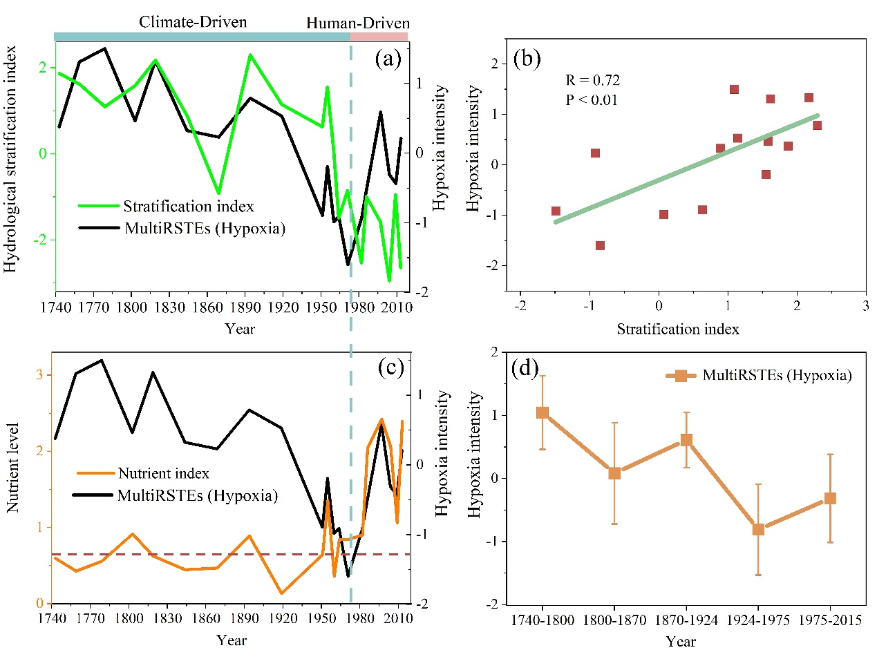 图2:低氧及其主要驱动因素之间的关系。(a)低氧与层化指标,(b)1740-1975年低氧与层化关系,(c)低氧与营养盐指标,(d)特征阶段低氧强度。