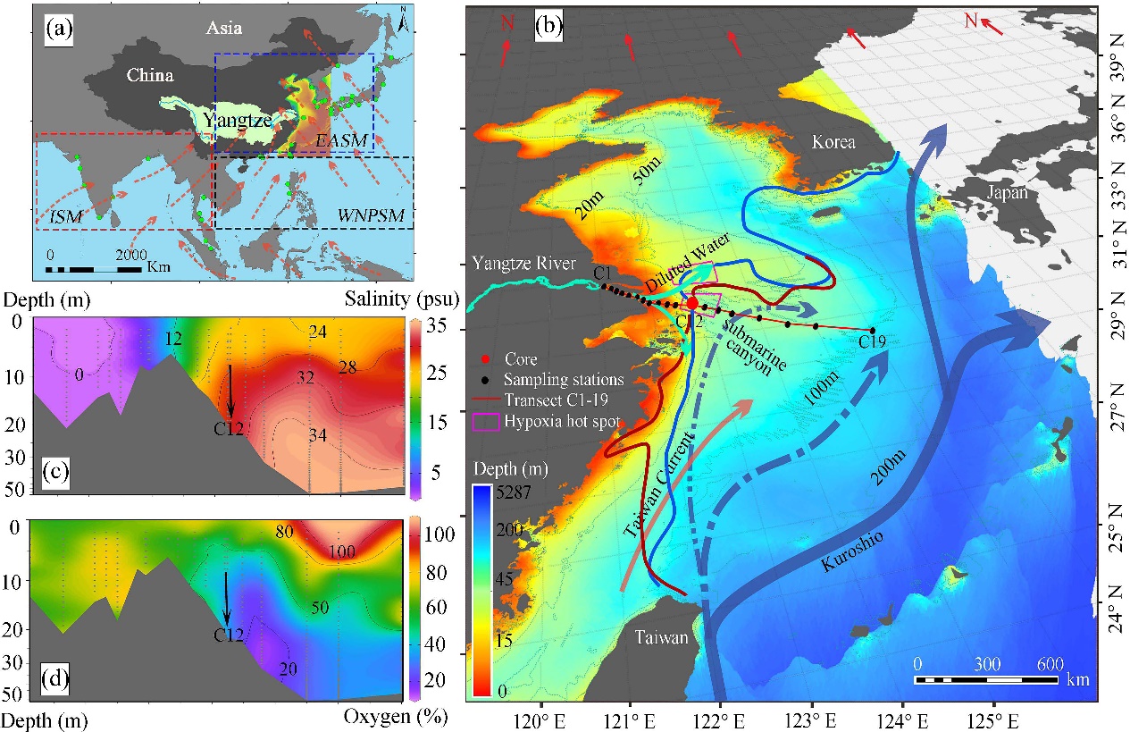 图1:长江流域、河口及河流主导的陆架系统。(a)东亚季风系统,(b)采样观测站位及东海区域海流模式,(c)盐度观测剖面,(d)低氧观测剖面。其中,红色圆点C12为岩心采样站位。