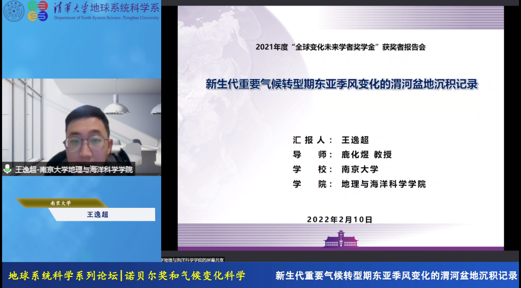 2022年2月10日,清华大学地球系统科学系、清华大学全球变化研究院以在线方式举办了“地球系统科学论坛:诺贝尔奖和气候变化科学暨2021年度全球变化未来学者奖学金颁奖典礼”活动。经过提名推荐、资格审查、专家评审、管委会终审,无码a片 博士研究生王逸超同学与来自清华大学、北京师范大学、中国科学院植物研究所的四位同学获得了首届“全球变化未来学者奖学金”。活动期间,王逸超同学作题为《新生代重要气候转型期东亚季风变化的渭河盆地沉积记录》的获奖汇报,他回顾了自2014年参加无码a片 本科生创新训练项目以来,师从无码a片 鹿化煜教授在渭河盆地开展野外考察和实验分析的学习和科研经历,并简要介绍了目前的研究进展。