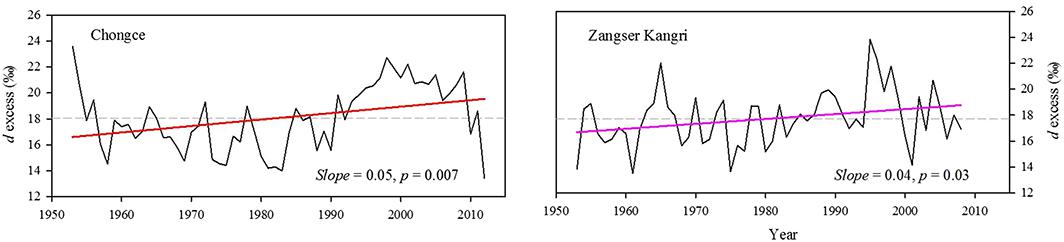 局地水汽再循环是影响青藏高原地区水循环的重要过程。然而,由于观测数据少且时间较短,目前有关青藏高原地区(尤其是青藏高原西北部地区)水汽再循环的研究较少且局限于季节尺度。侯书贵教授研究团队采用基于过量氘的水汽同位素平衡模型,尝试使用青藏高原西北部两支冰芯(崇测和藏色岗日)中的过量氘序列(图1),来定量化分析高原西北部局地水汽再循环比在过去几十年的变化。结果发现,在过去几十年中,水汽再循环对高原西北部的降水贡献率接近50%,而且在最近十几年中呈现增强的趋势(图2)。这一现象可能是由过去几十年高原西北部地区气候及环境变化引起的。分析表明,过去几十年中,高原西北部的温度和降水显著增加,导致局地地表水汽蒸发加强,局地水汽再循环也随之增强。其次,高原地表植被覆盖度增加,蒸散作用的增加对局地水汽再循环也有一定的加强作用。