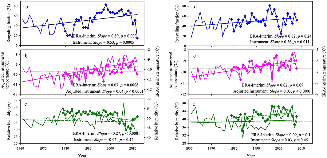 图2基于气象站和ERA-Interim数据获得的水汽再循环比率、温度和相对湿度序列