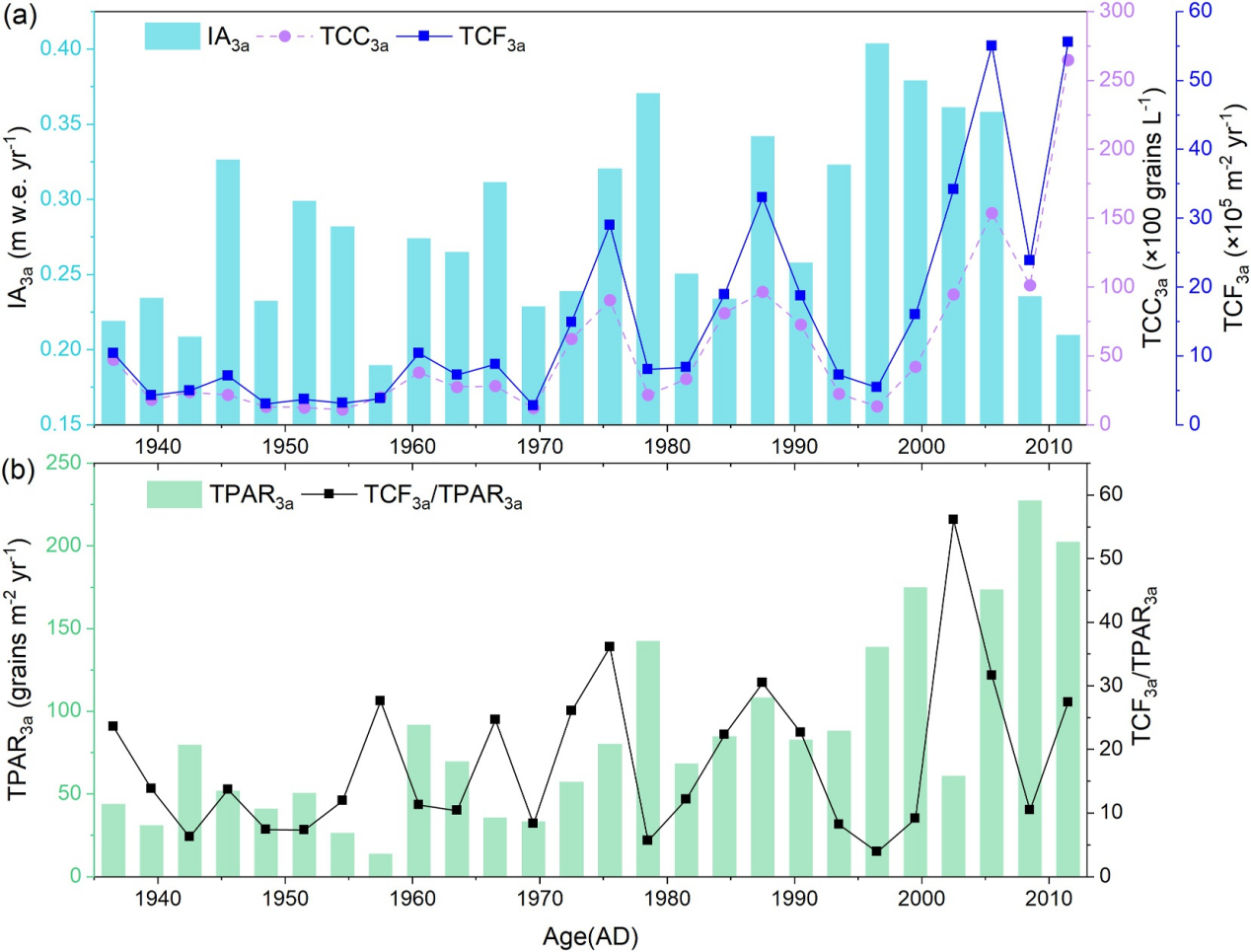 图2. 崇测冰芯总炭屑通量与冰芯积累率和总花粉积累率的对比