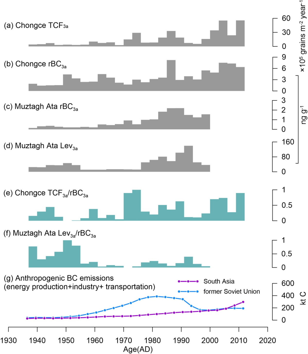 本研究获取了青藏高原西部崇测冰芯上部30.5m的炭屑记录,重建了1935-2012年研究区生物质燃烧排放历史,发现1970年代以后生物质燃烧排放显著增加(图2)。基于HYSPLIT后向轨迹模型识别了炭屑排放源区,并且通过全球火灾排放数据库(GFED)验证了总炭屑通量是生物质燃烧排放的可靠代用指标(图3)。与花粉记录、气候(CRU)、土地利用(HYDE)等数据综合分析,揭示了1970年代以来,生物质燃烧排放由气候—植被自然调控转变为农业燃烧等人为活动主导(图4)。此外,研究表明,生物质燃烧是崇测冰芯黑碳的主要来源,表明人为火灾加剧了青藏高原吸光性气溶胶沉降,从而可能加速冰川消融(图5)。