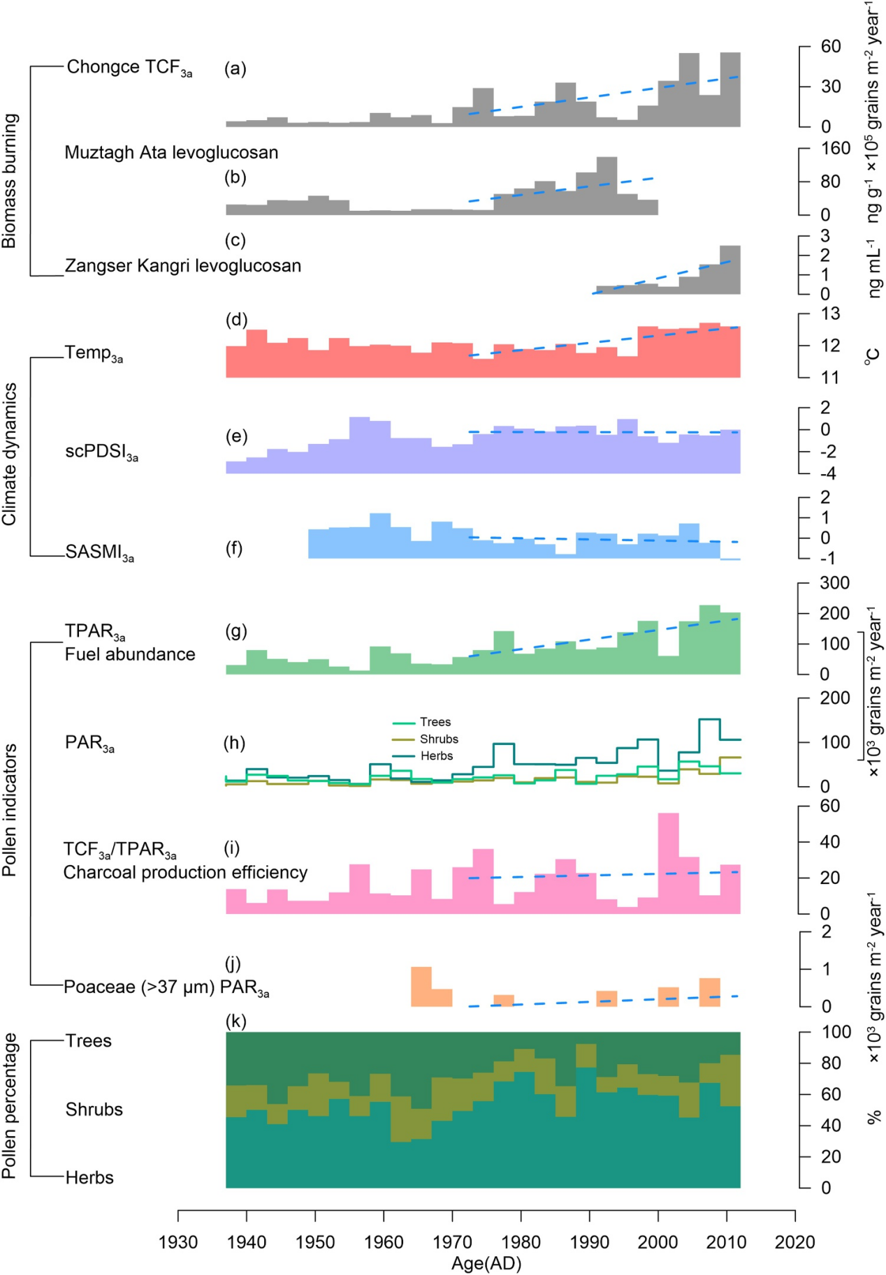 研究团队首次利用青藏高原冰芯炭屑记录重建了生物质燃烧排放历史,这一成果不仅使该地区冰芯炭屑研究更加系统和深入,也为冰芯炭屑的生态解释奠定了理论基础。该研究整合了冰芯学、孢粉学、气候学以及土地利用/覆盖变化等多学科方法,揭示了青藏高原西部地区生物质燃烧排放的驱动机制从气候—植被自然调控向人为活动主导的根本转变。上述成果为理解历史时期火灾演变规律及其对“亚洲水塔”冰川系统影响提供了重要的科学依据。
