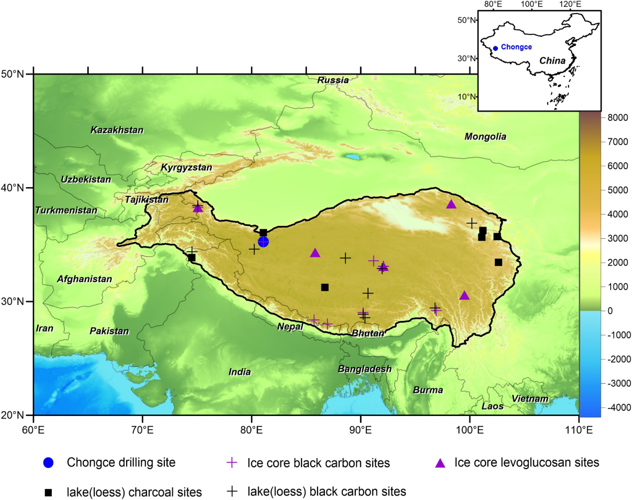 生物质燃烧是地球系统中的关键过程,对陆地生态系统、大气气溶胶及全球碳循环产生深远影响。青藏高原被誉为“亚洲水塔”,其冰川系统变化直接影响下游数十亿人口的水资源安全,但由于高原地区观测时间跨度短、古环境档案资料相对匮乏,缺少长期、高分辨率的生物质燃烧排放记录,制约了对火灾演变规律及其驱动机制的认识。过往研究基于该地区冰芯(黑碳、左旋葡聚糖)、黄土/湖泊沉积(炭屑、黑碳)等记录,揭示了全新世晚期火灾驱动机制转变,但主要集中于青藏高原中东部地区,在对气候变化高度敏感的西部地区,相关研究相对薄弱,缺少直接反映生物质燃烧的冰芯炭屑记录(图1)。