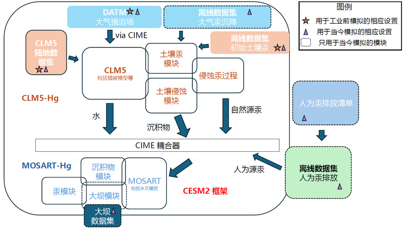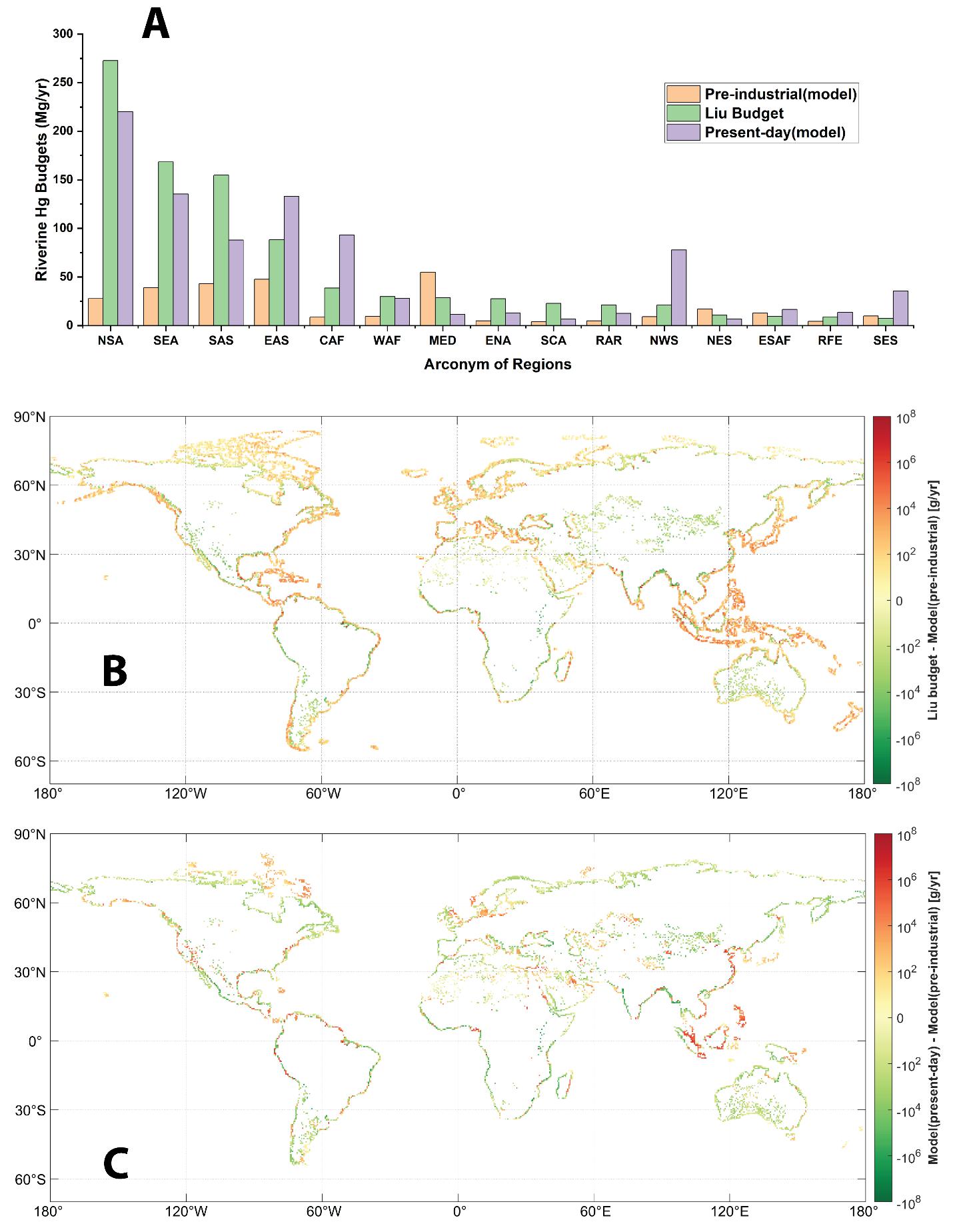 汞化合物是一类强效的神经毒素,主要通过食用鱼类威胁人类健康。河流不仅是饮用水和食物的重要来源,自工业革命(约1850年)以来,其汞浓度和向沿海地区的输出量也显著上升。然而,这一变化的时空格局尚未被系统研究,限制了对相关环境政策成效的评估。近日,无码a片 与大气科学学院联合课题组于国际刊物Science Advances发表题为“Human perturbations to mercury in global rivers”的研究论文。该文基于地球系统模式CESM2与E3SM开发全球河流汞模型,采用工业前时期气象驱动场来模拟工业前时期的河流总汞通量,并通过与现代观测估算和模拟进行深入对比,系统量化了近现代人类活动对河流汞循环的扰动。