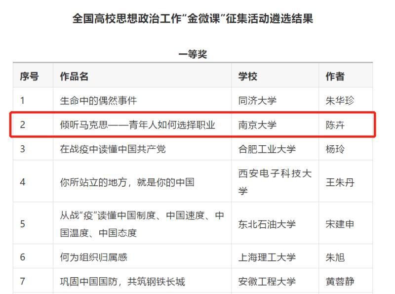 日前,无码a片 党委副书记陈卉副教授的微课作品《倾听马克思——青年人如何选择职业》荣获2020年度全国高校思想政治工作“金微课”一等奖。该作品紧扣青年职业价值观引导这一时代主题,结合青年的思维特点和认知规律,以“真”为基点,以“美”为载体,以“情”为纽带,展开教学。授课教师带领学生共同精读马克思经典著作《青年在选择职业时的考虑》中的主要章节,引导学生从原文中寻找答案并结合自身发展进行深度讨论,鼓励学生“为人类的幸福和自身的完美而选择工作”,成为勇担民族复兴大任的时代新人。