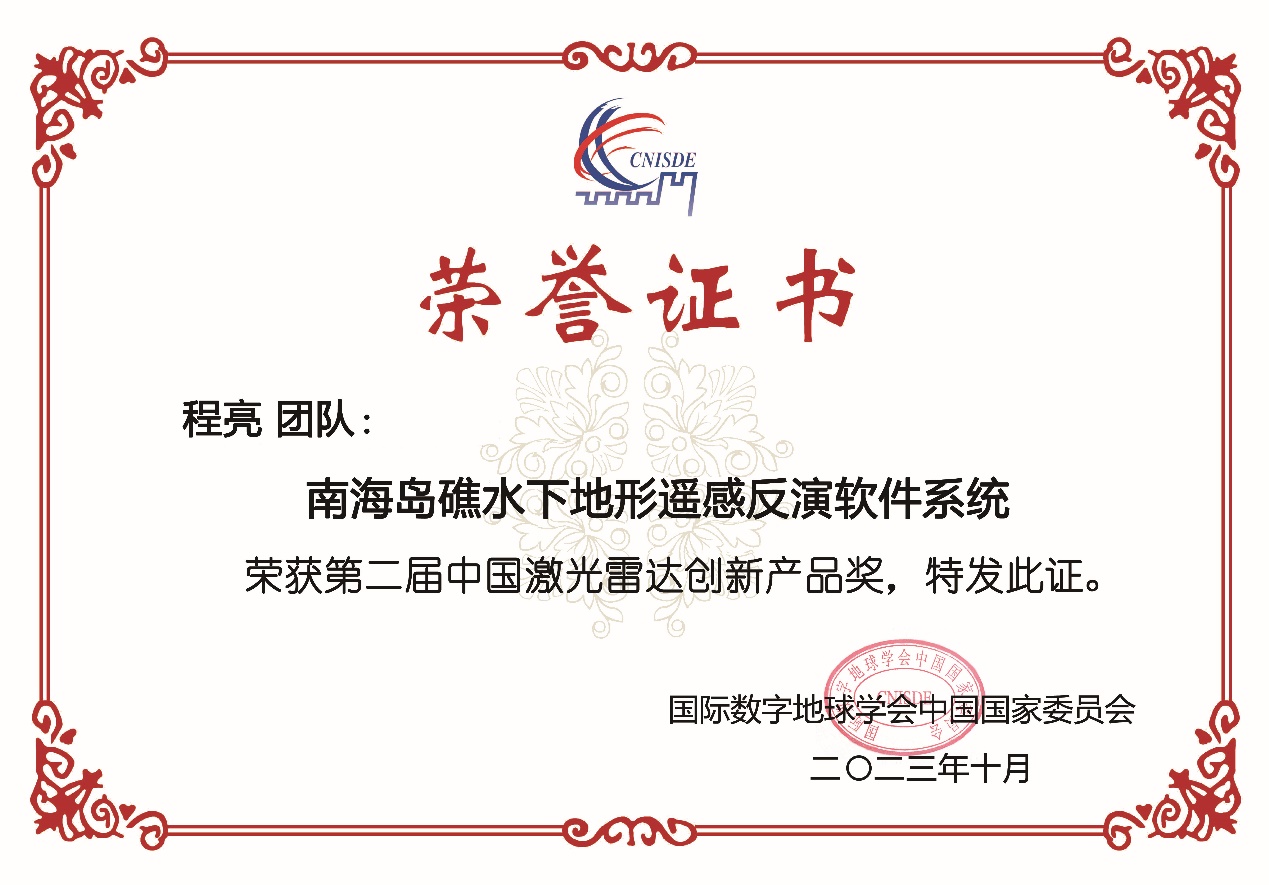 2023年10月20-22日,第七届全国激光雷达大会在河南理工大学成功举办,无码a片 程亮教授团队研制的“南海岛礁水下地形遥感反演软件系统”获中国激光雷达创新产品奖(共5项),楚森森博士获中国激光雷达青年科学家提名奖。