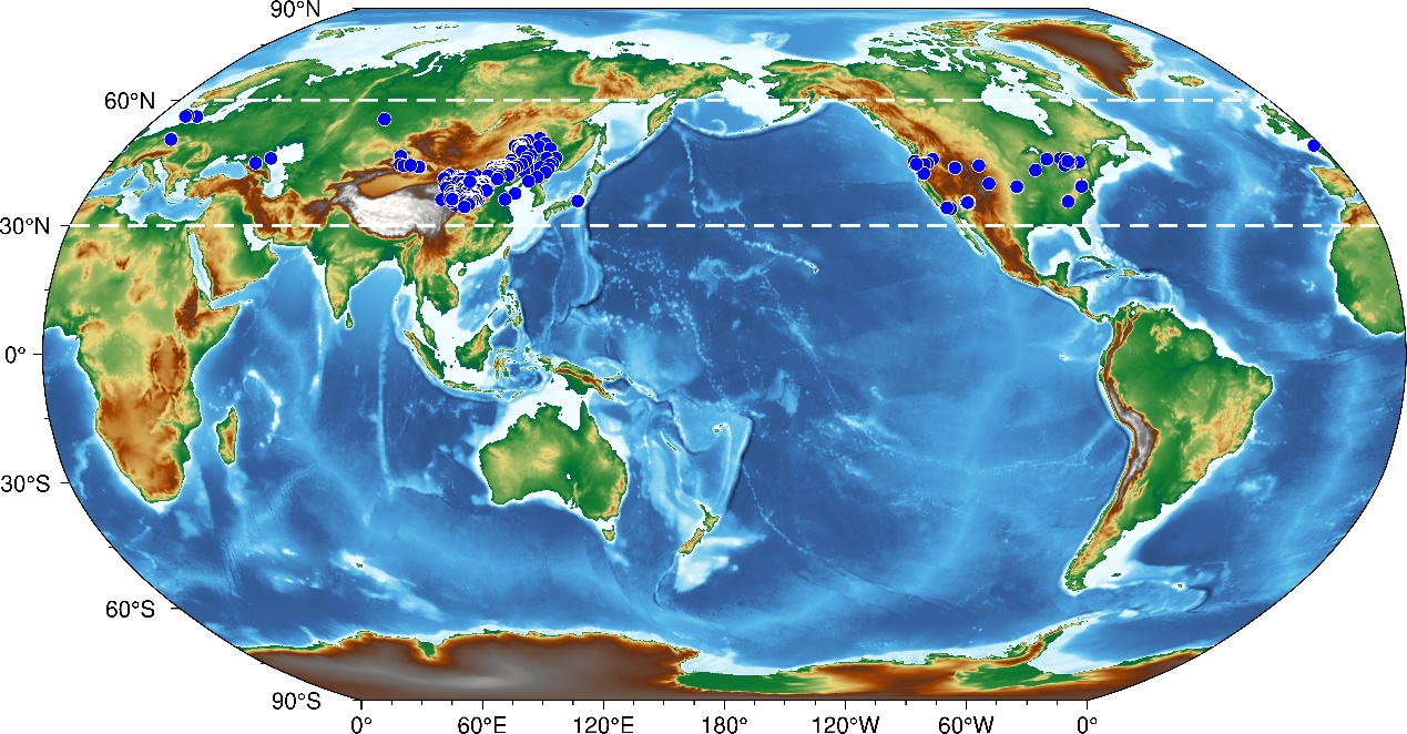 无码a片 联合相关合作单位近期开展了一项研究,尝试利用土壤有机碳同位素指标进行古温度重建,并成功定量了季风边缘区全新世夏季温度和活动积温的变化过程。该研究选择东亚季风边缘区的浑善达克沙地东缘格类河(GLH)砂黄土剖面为研究对象,获得了该剖面全新世δ13Corg的变化结果;并从北半球中纬度地区(30N—60N)筛选出与该剖面相近热量带(限定T 10 C活动积温在1800~4200C·d范围内)的792个表土样点(图1),结合欧洲中期天气预报中心(ECMWF)提供的全球气候第五代大气再分析数据(ERA5),系统分析空间表土样品有机碳同位素与现代温度和降水之间的相关关系。