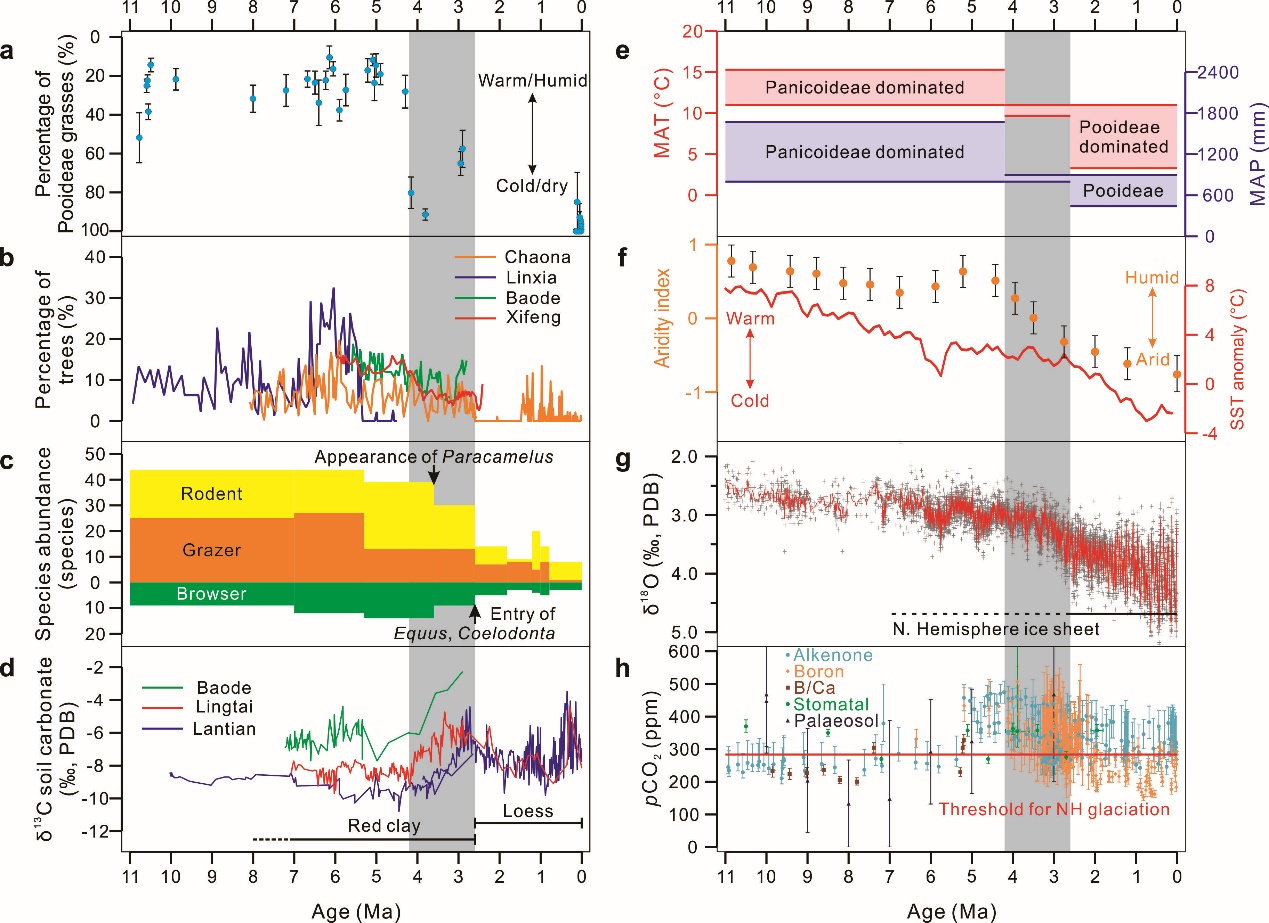 以博士生王翰林为第一作者、鹿化煜教授为通讯作者发表在Nature Communications的研究论文,通过对渭河盆地沉积物植硅体的系统研究,发现在上新世末期(距今约300万年前后)植被中的草类增多,并占据主导地位,与之前的森林草原植被相比,气候变干、季风降水减少28%。同时,他们通过全面的现代植被-气候数据分析,提出当时的全球温度降低、抑制了亚洲季风环流,中国北方气候变干。这一结论为上新世末期气候变干还是变湿的争议提供了关键证据。同时,他们提出当时全球温度降低是控制季风强度的主要因素,不同于长期流行的青藏高原快速抬升驱动季风降水增多的观点。这一结果得到国际权威专家的高度认可,是无码a片 师生独立完成的一项重要研究工作。