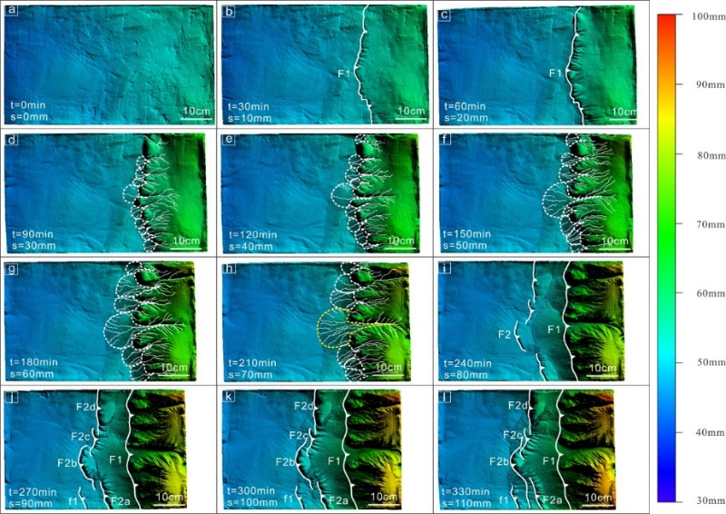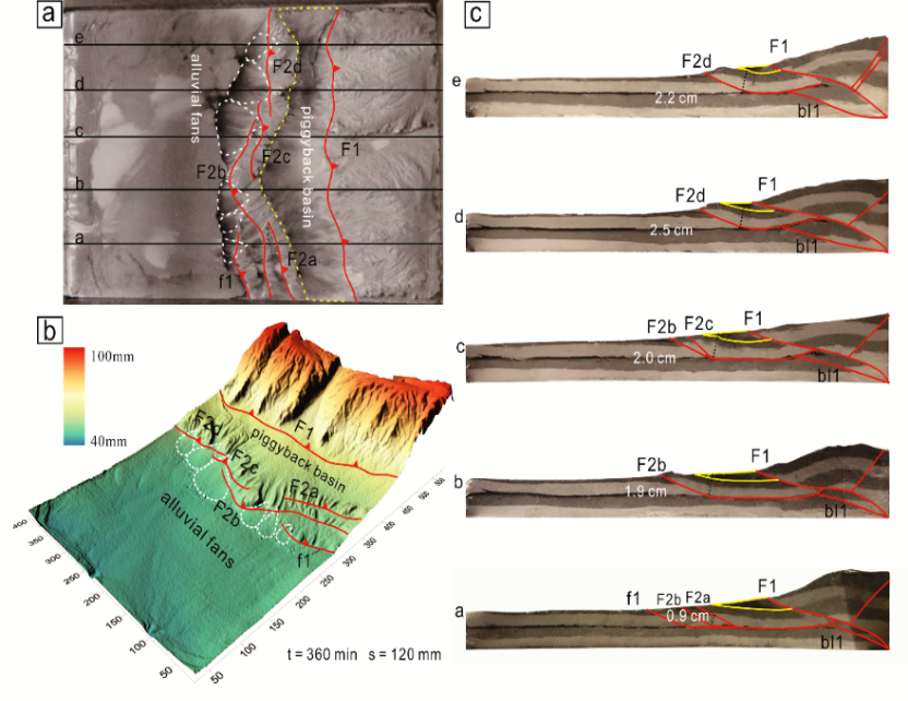 先前研究大多基于构造几何学、气候和地貌的综合分析推断其形成过程,缺乏构造地貌的动态演化过程和机制的探讨,而模拟能够为这一问题的解决提供必要途径。最近,无码a片 李一泉副教授和硕士生毛宇琼等通过构造地貌物理模拟实验,采用水饱和的材料,为更精细尺度的地表过程作用下褶皱冲断带的演化提供了新的视角(图1,2)。该研究设计了多组物理模拟实验,通过三维扫描仪获取地貌的动态演化过程,定量探讨了有无塑性滑脱层和不同地壳缩短速率下,褶皱冲断带地表过程对构造缩短的响应及其对构造发育的影响。相关研究结果发表在国际知名学术刊物《Tectonics》上。