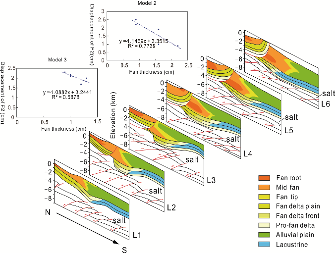 研究发现侵蚀和沉积不但受到构造作用的控制,还会反过来影响新生构造发育的位置、形态、幅度以及构造的侧向传播和连接。山前沉积物的分布主要影响了新构造的位置,新生褶皱的轴面产生通常相交于冲积扇前缘。另外,还发现沉积物厚度与断层滑移量呈不同程度的负相关(图4)。特别是当冲积扇大小分布差异巨大时会导致构造分段发育并通过侧向传播相连接。这对于理解新生构造的发育模式以及断层之间连接的形成具有一定的指示意义。