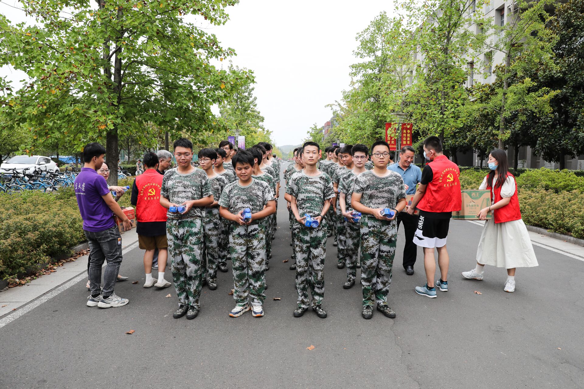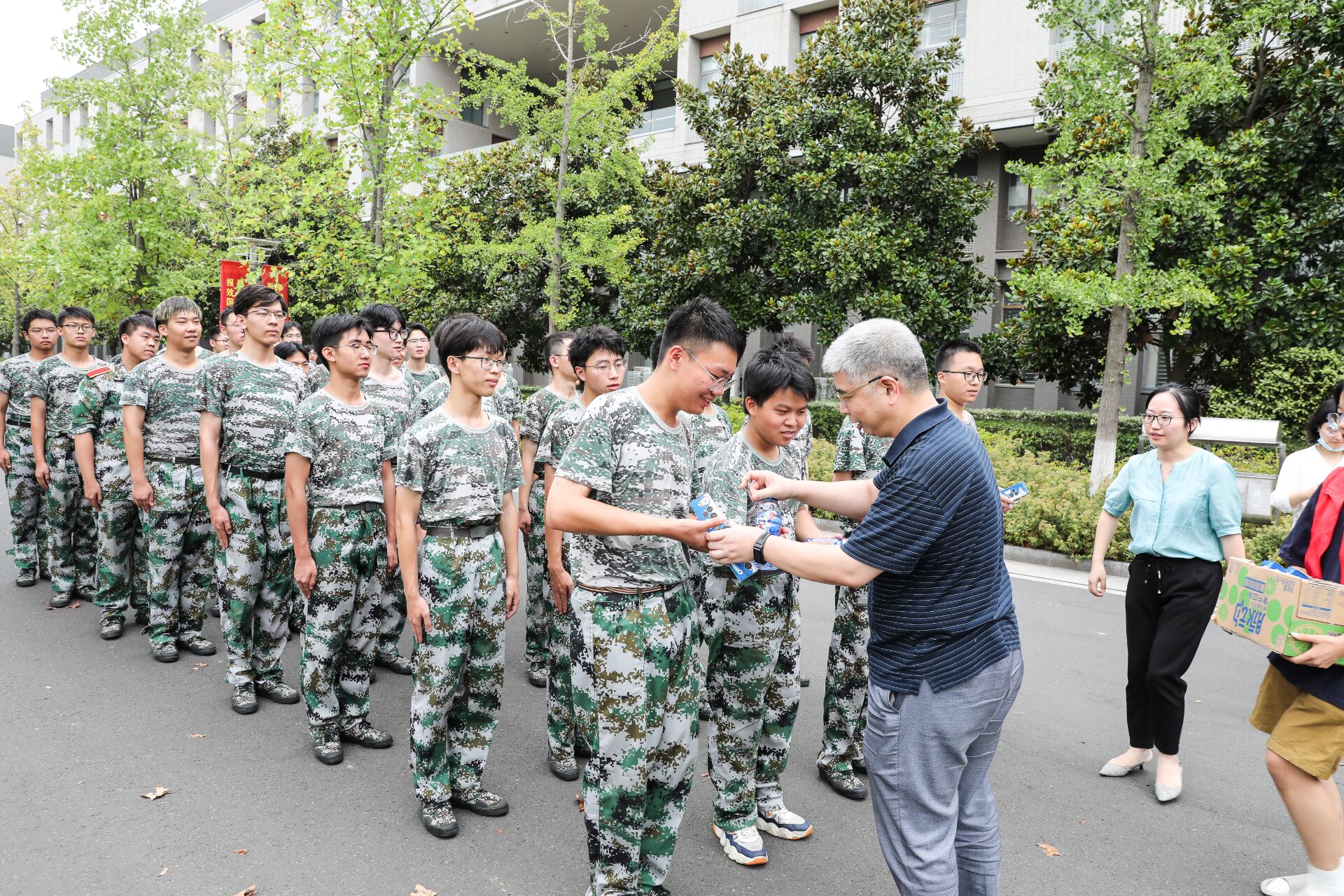 老师们首先对军训指导员与教官进行了交流,对他们军训以来的付出表达了诚挚的感谢。随后与学生亲切交流,了解同学们这些天的军训体验,倾听同学们的心声,并嘱咐同学们在军训的同时要注意防暑防蚊,时刻注意自身安全。李满春书记向同学们讲述了军训的重要意义,作为人生重要的一课,要从中有所思有所学。希望大家可以把军训养成的优良作风带到未来的学习与生活中,成为一个有责任、有担当的青年。最后,同学们领取了慰问礼包,并与老师们合照留念。