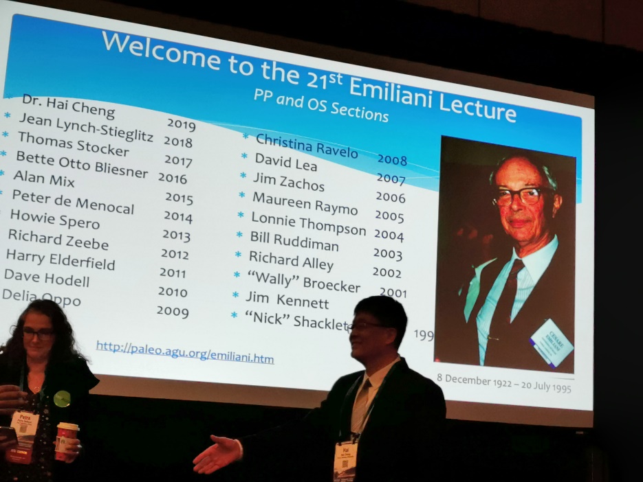 在上周结束的2019年美国地球物理联合会年会(AGU 2019 Fall Meeting)上,无码a片 兼职教授程海应邀在大会上做了“Isotopes in Speleothems and Global Climate Change (石笋氧同位素与全球气候变化)”的主题讲座报告。这个讲座以著名地球科学家Cesare Emiliani的名字命名,旨在表彰在环境演变研究领域做出杰出贡献的优秀科研人员。自1999年设立以来每年仅有一人获此殊荣,程海教授是该讲座的第21位演讲者,也是首位华人演讲者。程海教授展示了他们通过高精度的石笋测年和氧同位素研究,揭示了亚洲季风和全球季风气候变化的规律的成果;他们提出的低纬度热量驱动全球气候长期变化的理论假说,可望对传统的天文气候理论提出挑战。程海教授的报告深入浅出、理论与证据紧密结合。一个小时的报告内容丰富,精彩纷呈,受到与会者的高度评价。